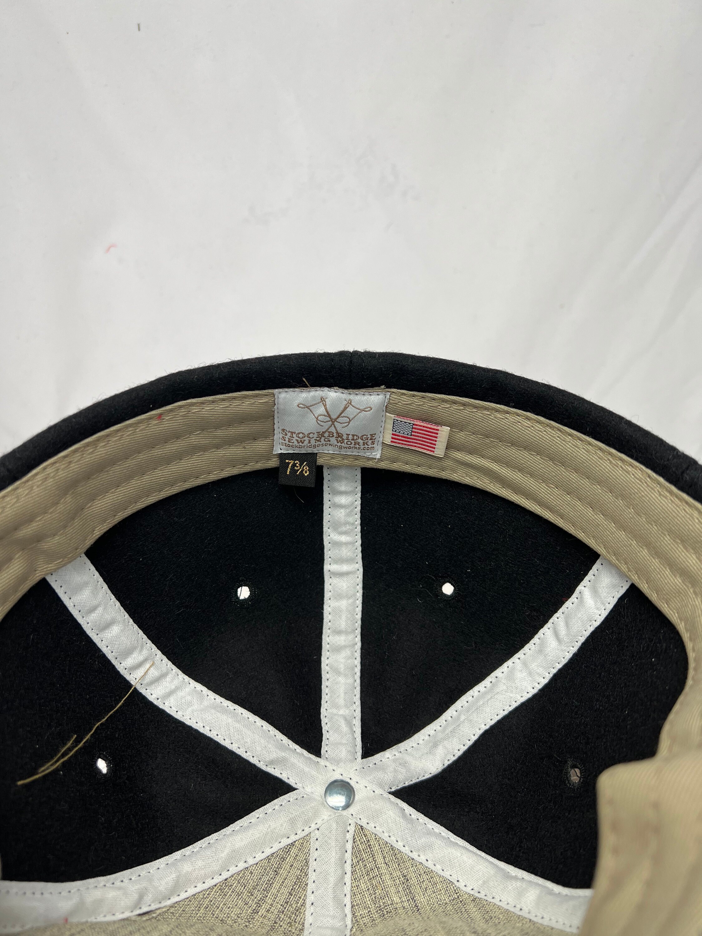 Brown wool boxcap with 3” visor, three rows gold soutache, gold button, fitted size 7 5/8 with brushed cotton sweatband.
