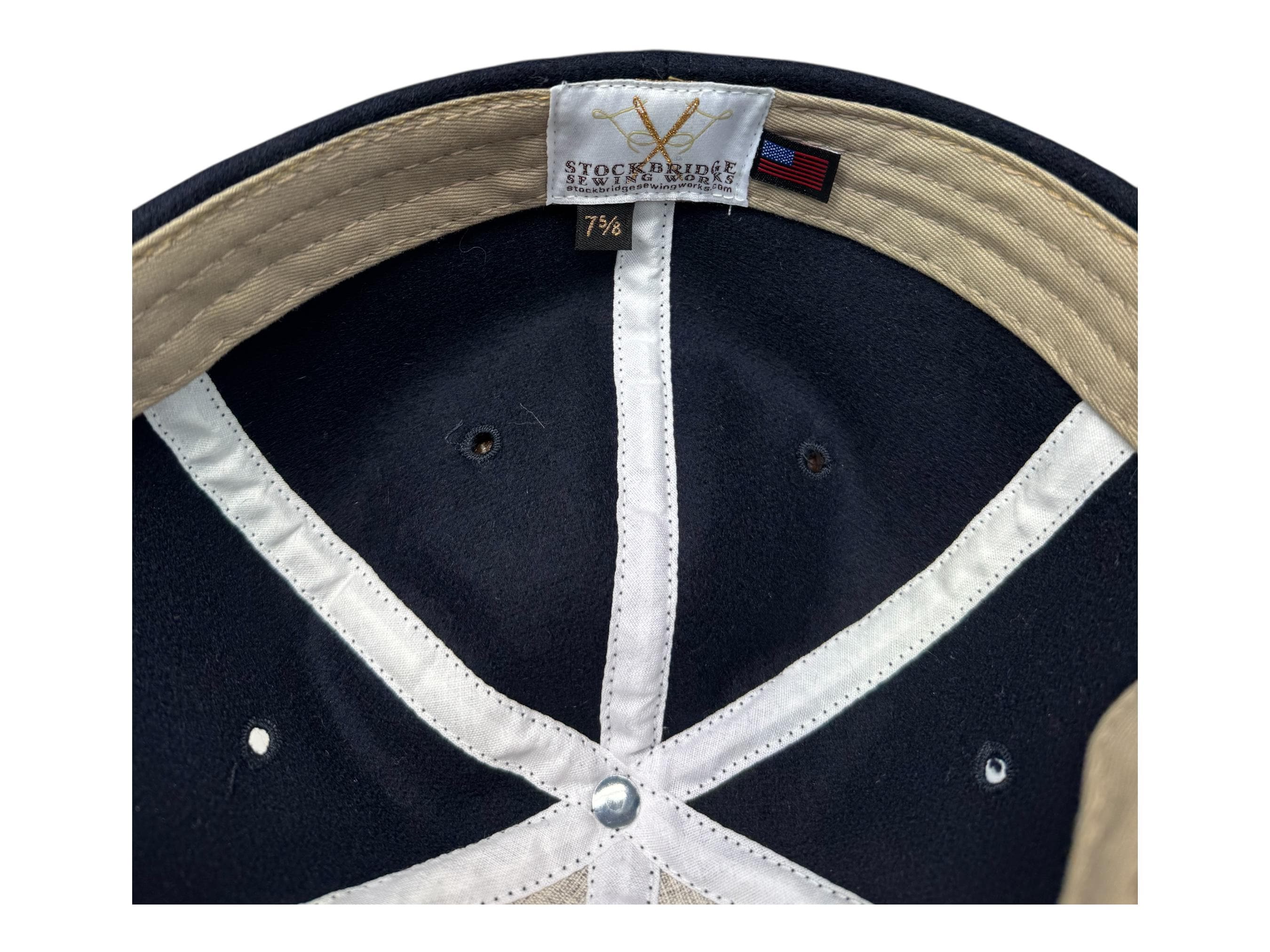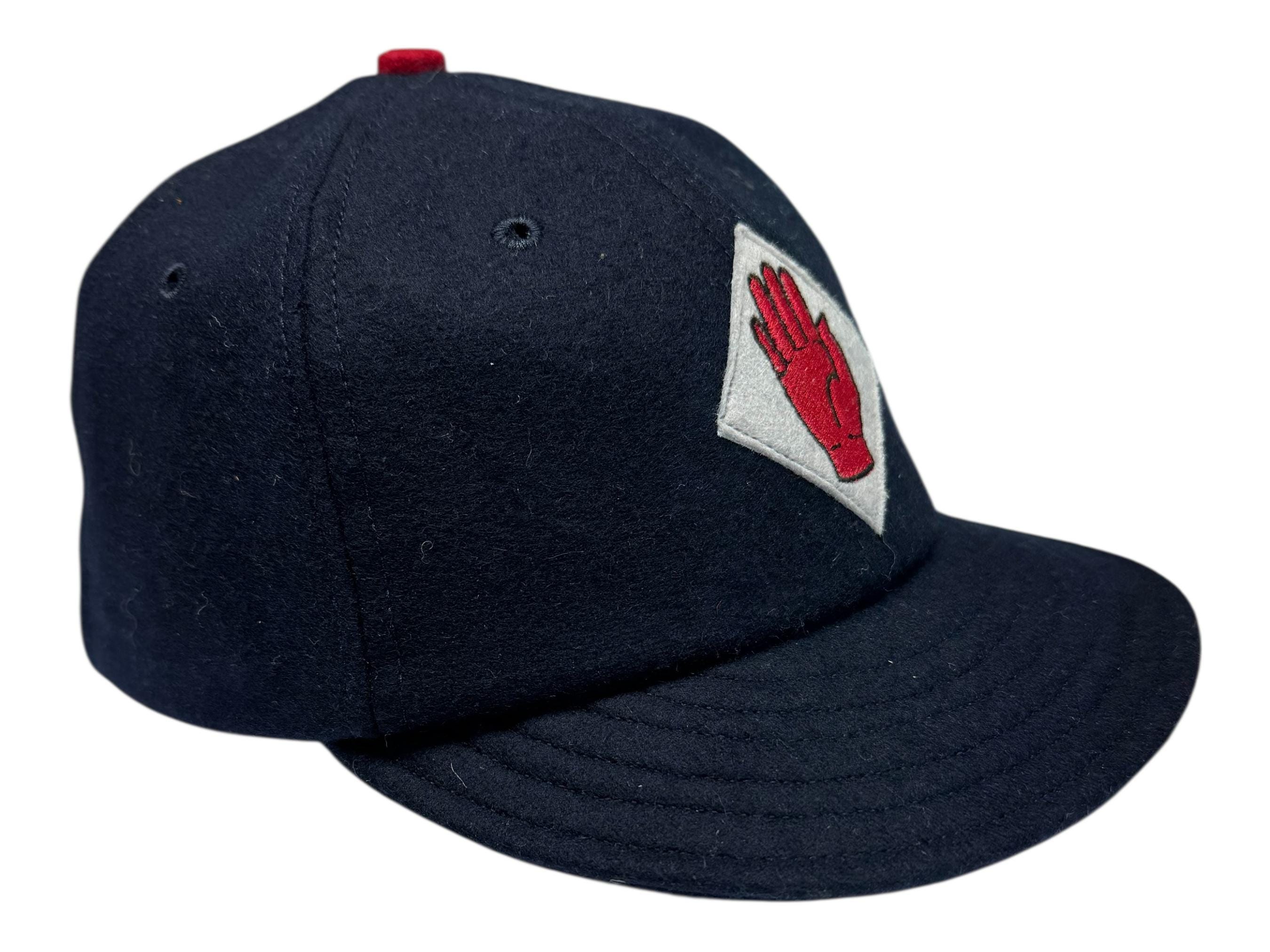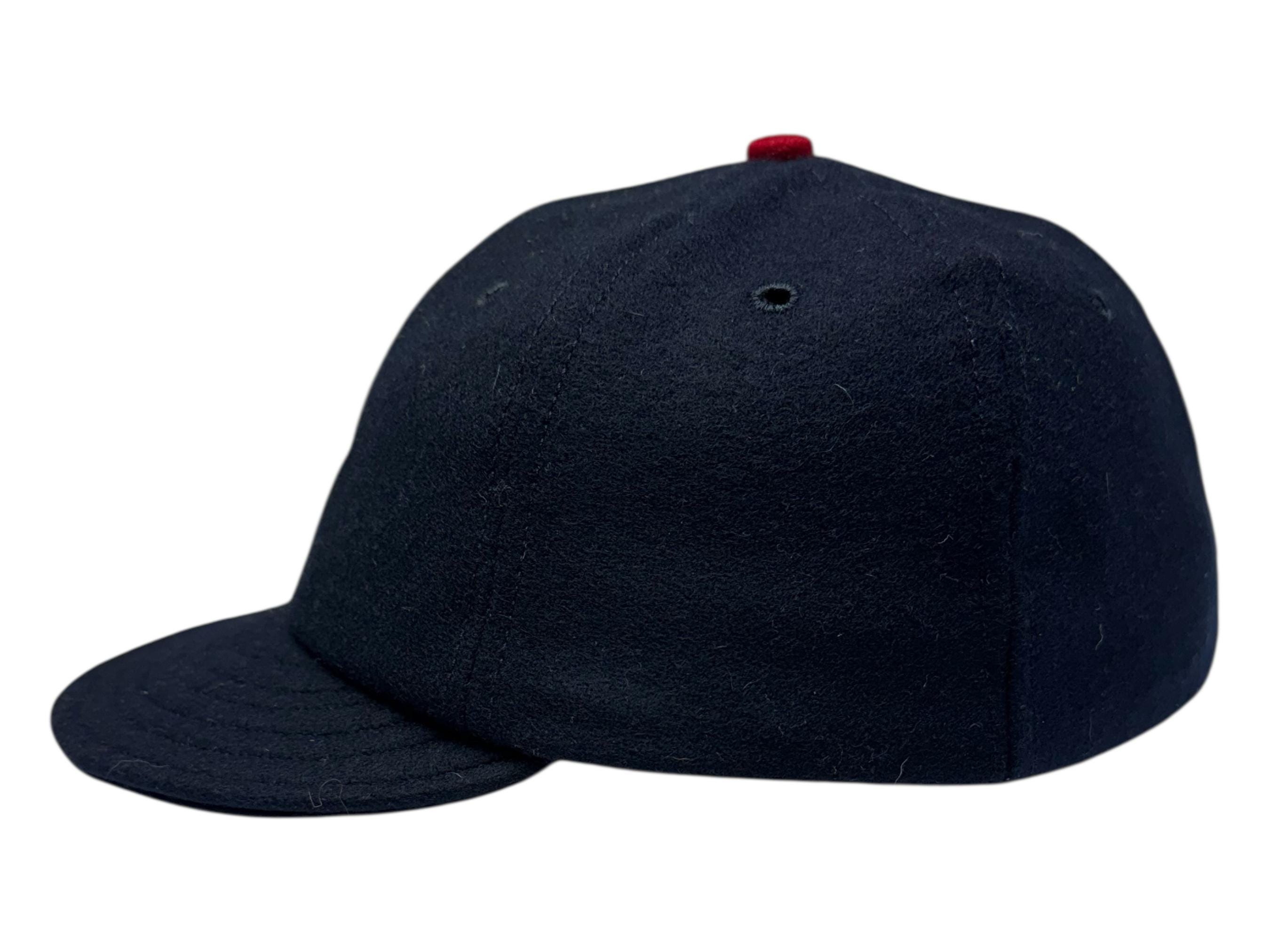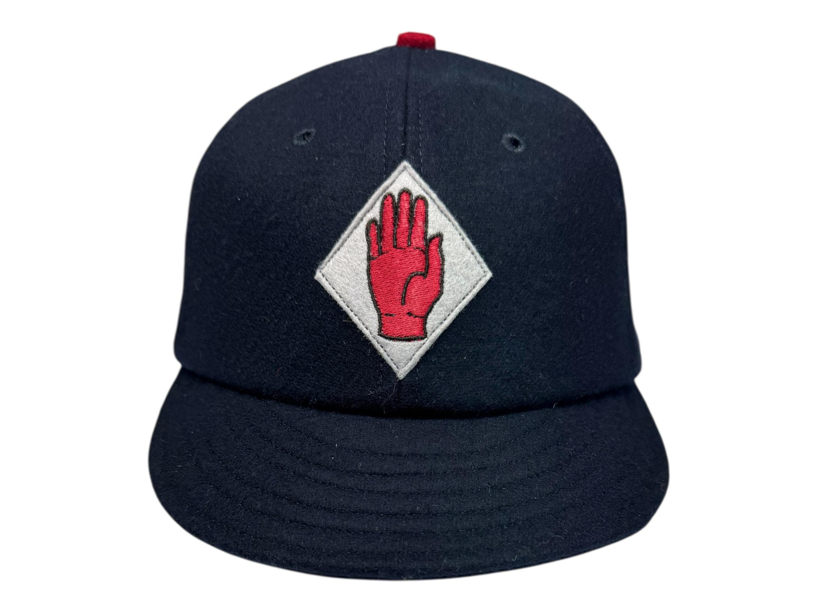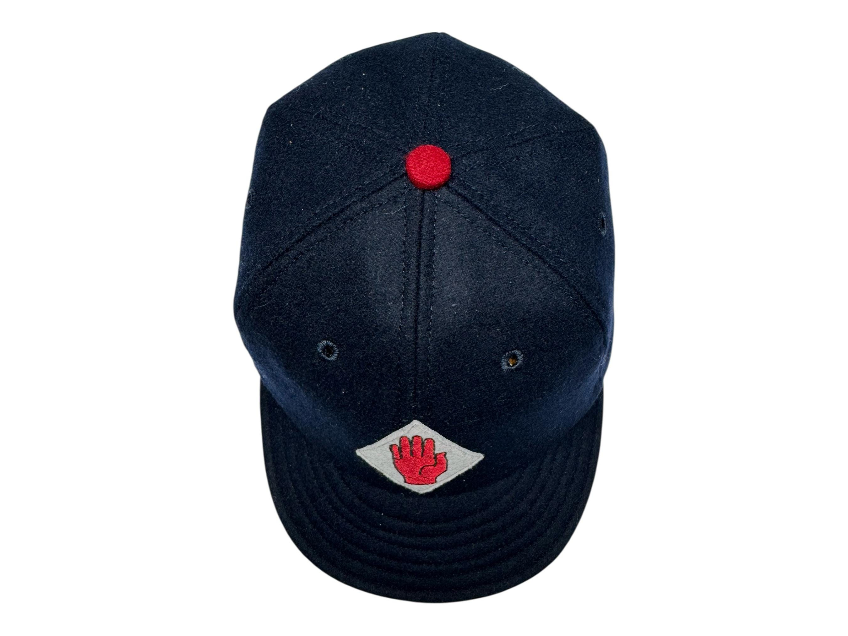 This cap is a navy melton wool with a 2” soft visor. The embroidered grey felt diamond logo with red hand and top button helps these players really stands out amidst the field of dreams they play on. Fitted to any size with a cotton sweatband. Soon to become your favorite cap!