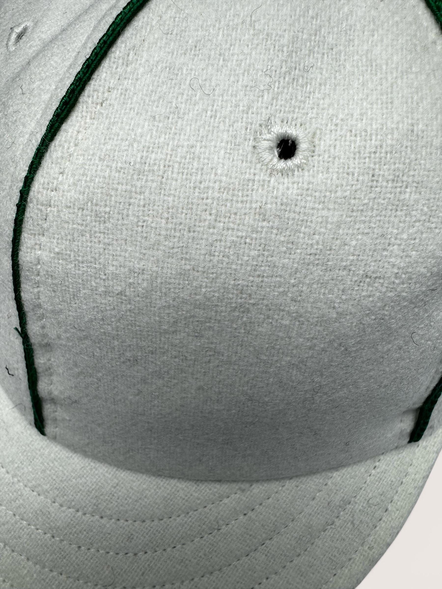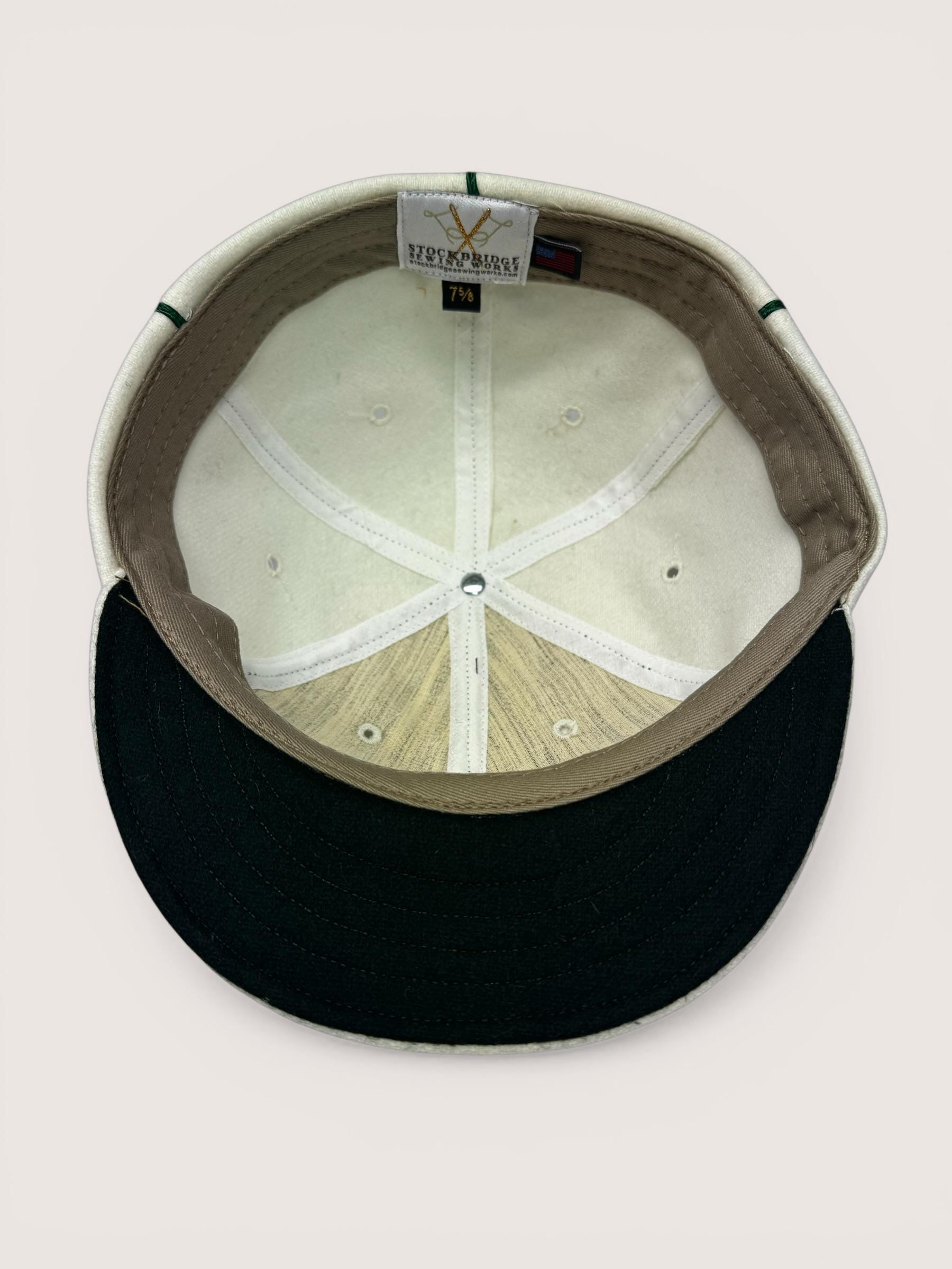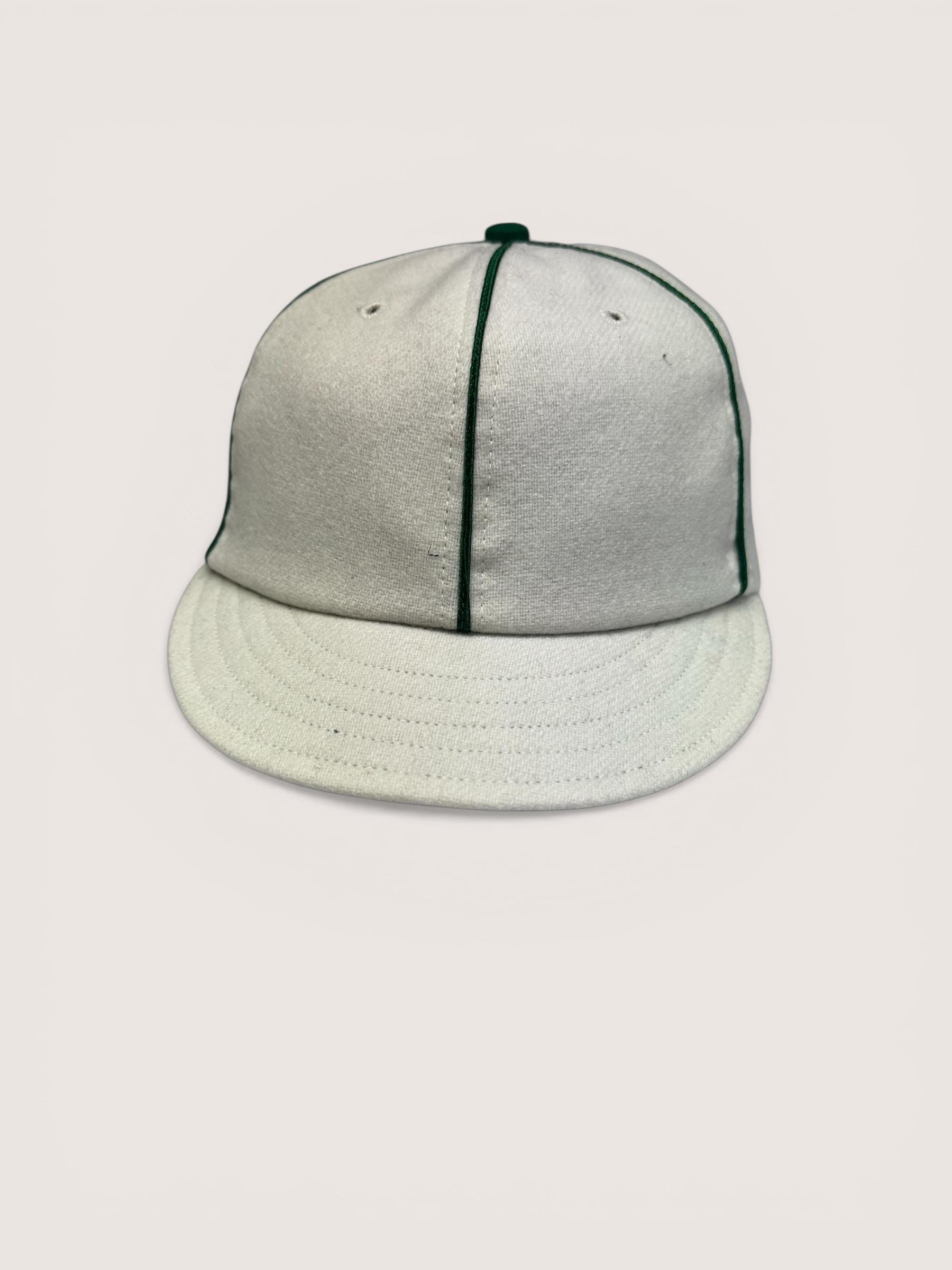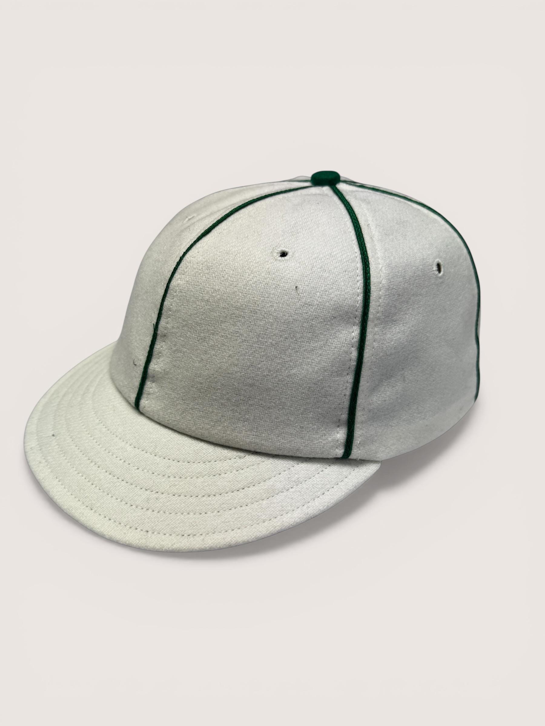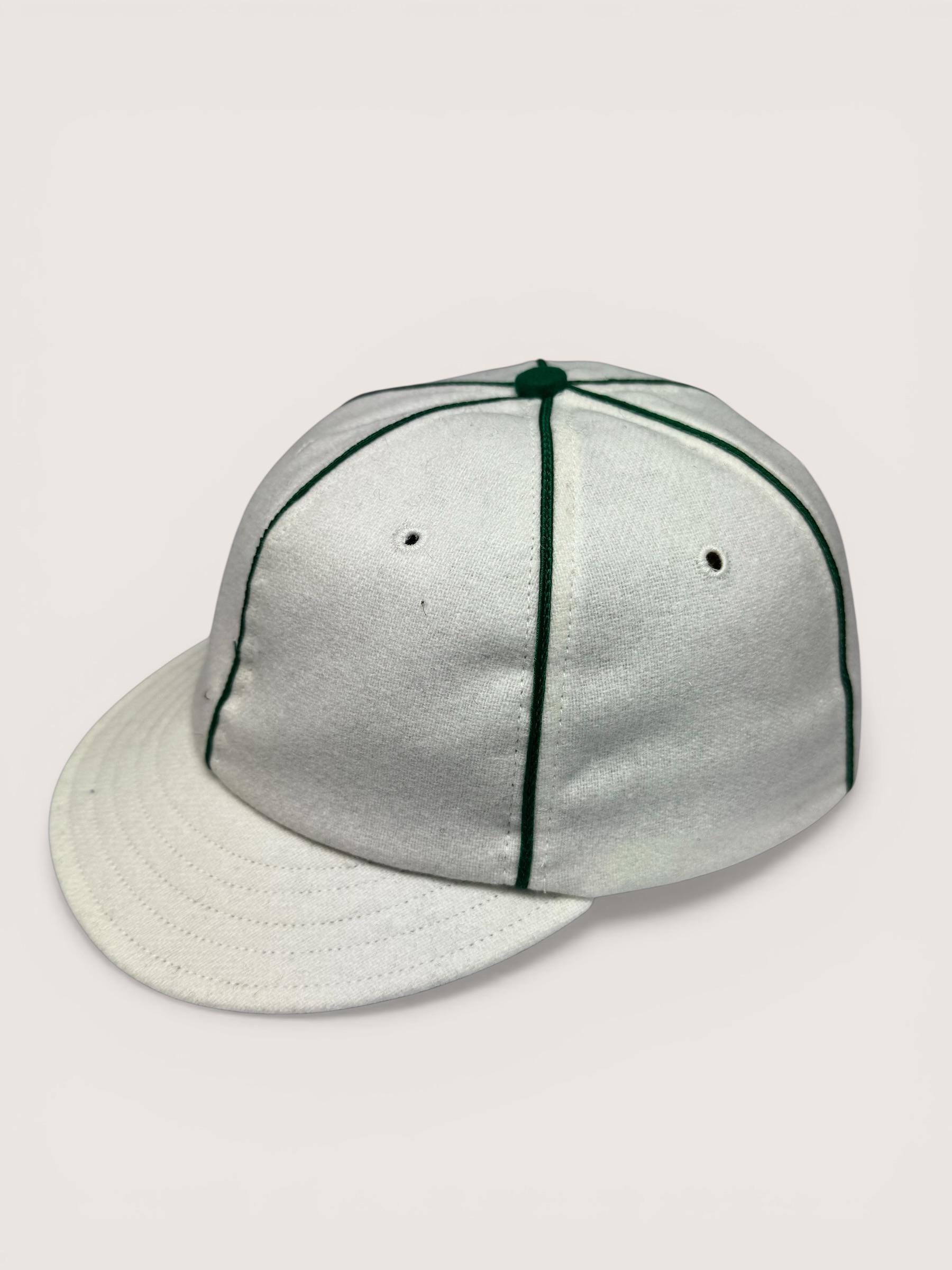 The New York Mutuals vintage base ball team cap is available. The cap is hand crafted from 100% white wool flannel with a 2” visor with dark green wool under visor. Kelly green soutache braid on seams, kelly green top button.