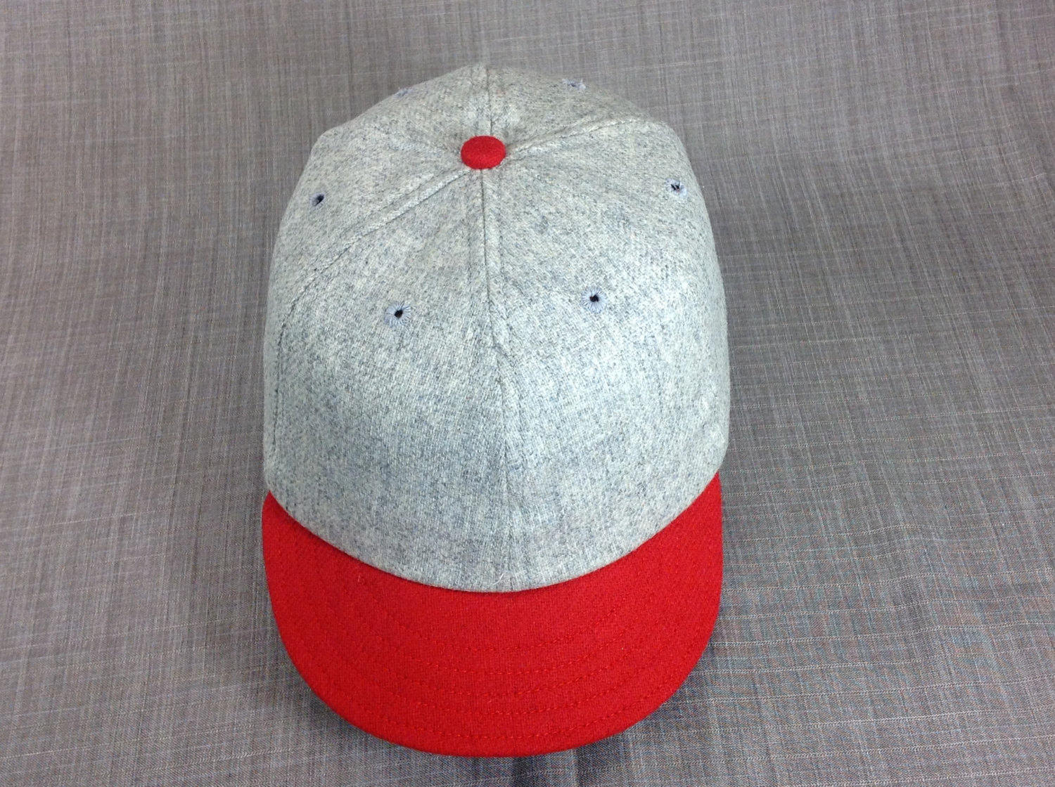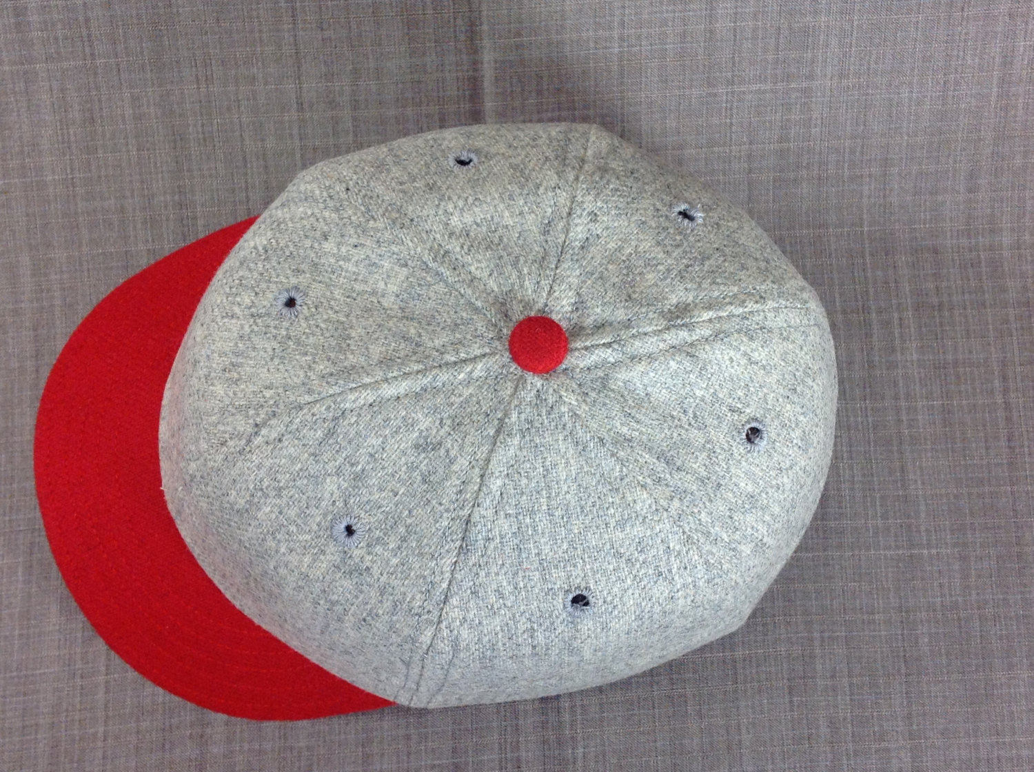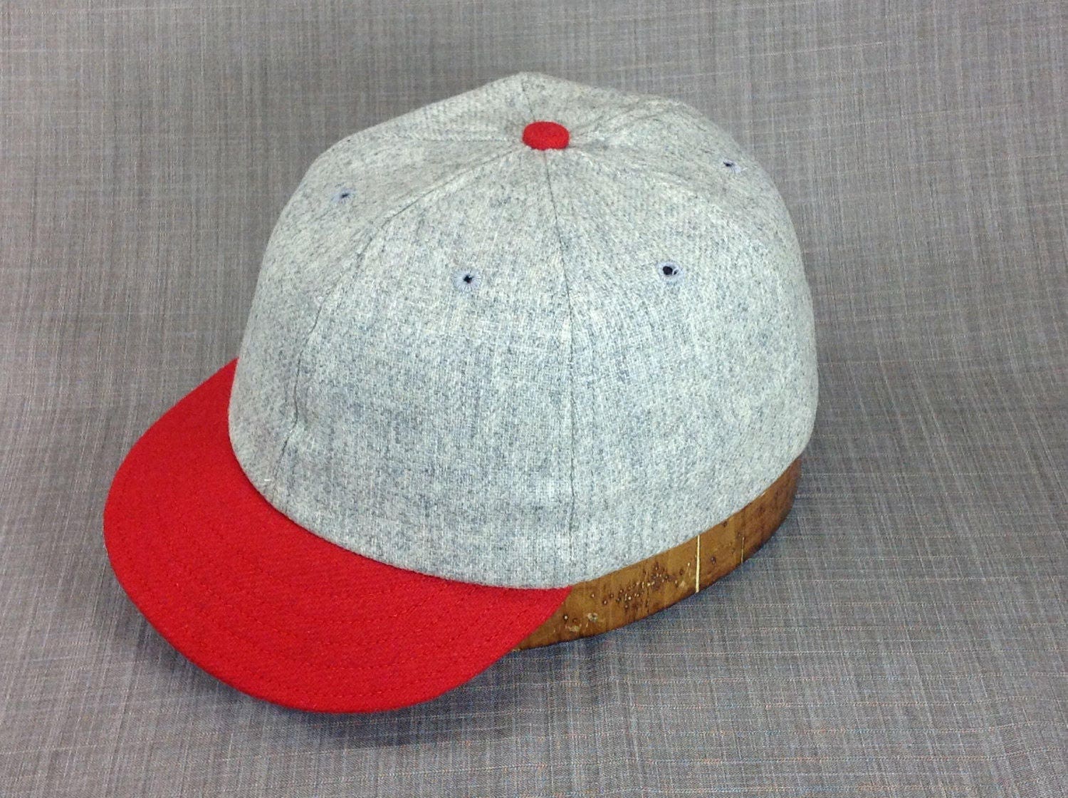 8 panel light grey wool flannel ballcap with red 1910s flexible visor, soutache on the seams & red button, leather sweatband, custom made size 7 1/4
