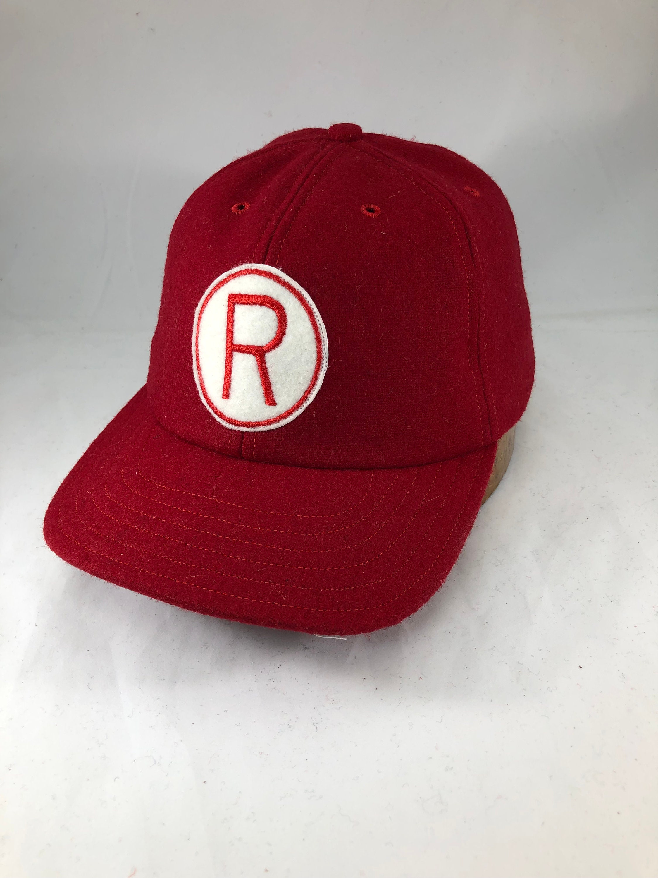 The dark red melton wool 6 panel cap has a wool felt patch with the embroidered Rockford Peaches R logo. Custom fitted to any size with cotton sweatband.